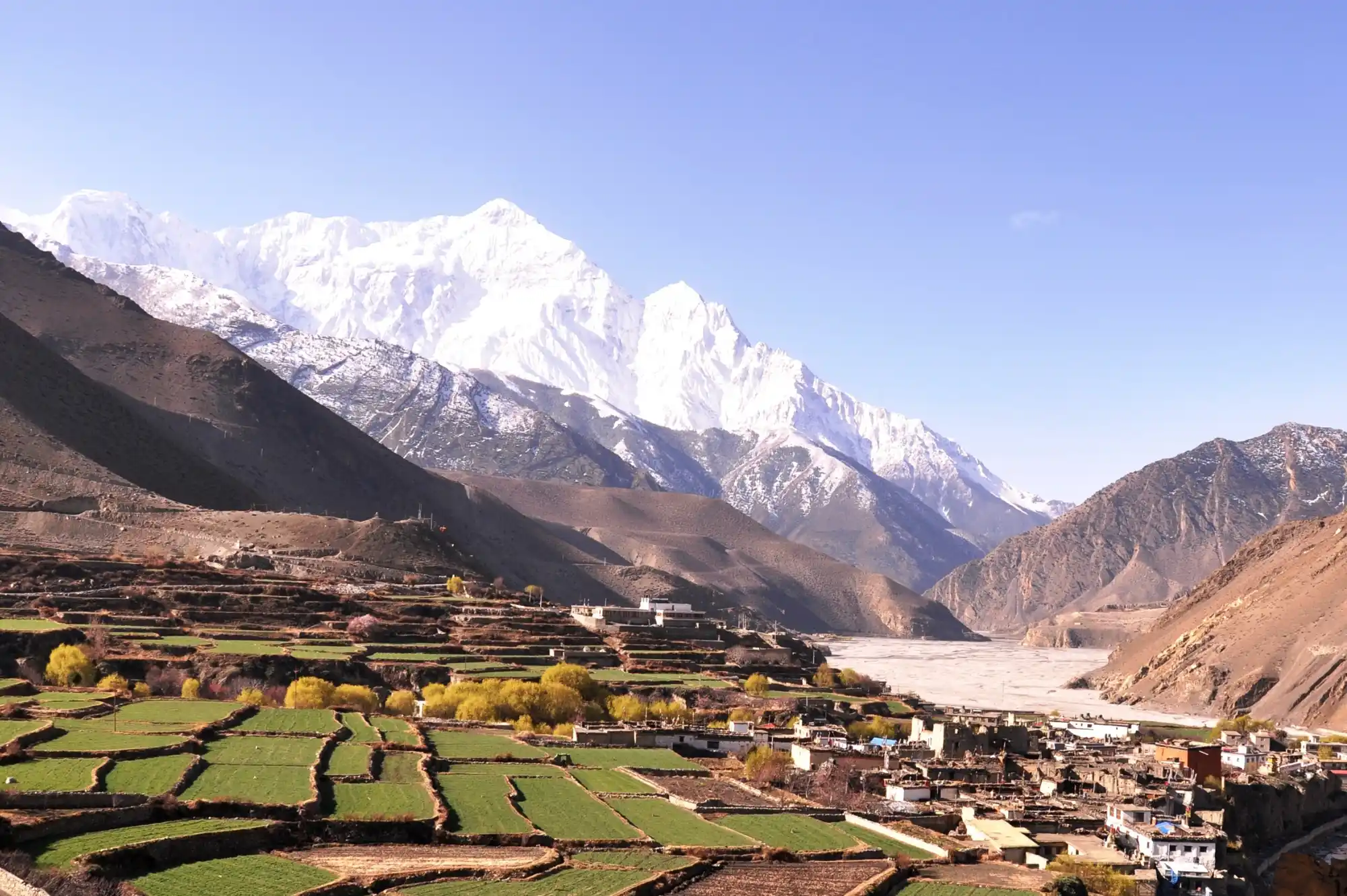 The adventure intensifies as we ride north into the Lower Mustang region. Leaving Pokhara, we pass through Beni before entering the Kali Gandaki Gorge—the deepest gorge in the world. The landscape becomes more rugged and dramatic with every kilometer. The route features thrilling water crossings and winds through charming villages known for their apple orchards. Our destination is the scenic settlement of Kalopani, nestled under the towering peaks of Dhaulagiri and Annapurna.